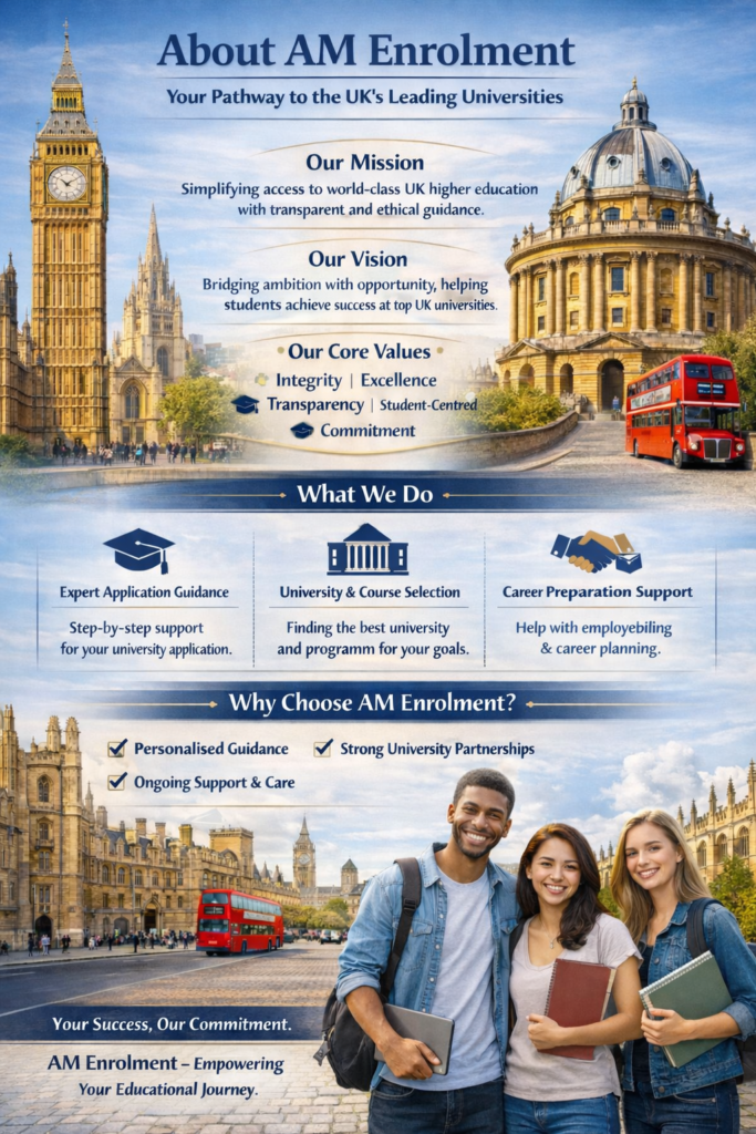 At AM Enrolment, your success is our highest priority. We are dedicated to helping you overcome challenges, make informed decisions, and begin your academic journey in the UK with clarity and confidence.